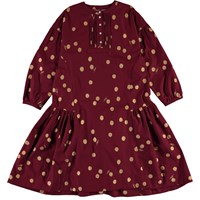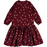 Cosimo er en boardeuax kjole med stor guld prikker. Kjolen har en let oversized pasform, lange ærmer, samt knappe lukning ved kraven.