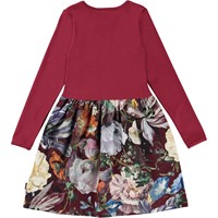 Credence er en kjole med mørkerød overdel i rib med lange ærmer og et skørt med print af store flotte farverige blomster.