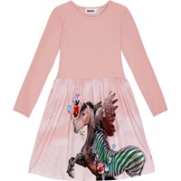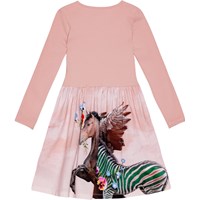 Pudderfarvet langærmet kjole i økologisk bomuld. Overdelen er tætsiddende i en ribbet jersey, mens skørtet er i en glat jersey. Det er en kjole med plads til leg og bevægelse, samt den er nem at komme i. Kjolens skørt har et print af en brun smuk pegasus og en festlig zebra med grønne striber, begge med blomster i munden.