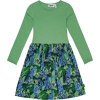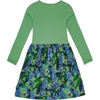 Langærmet grøn kjole i økologisk bomuld, der forener en tætsiddende overdel i ribbet jersey med et glat jersey skørt. Kjolen er let at komme i og tilbyder masser af plads til leg og bevægelse. Kjolens skørt har et alloverprint af blålilla sommerfuglebuske med flyvende sommerfugle i flotte farver.
