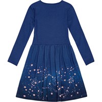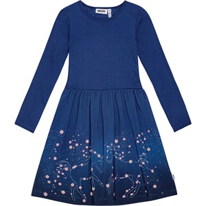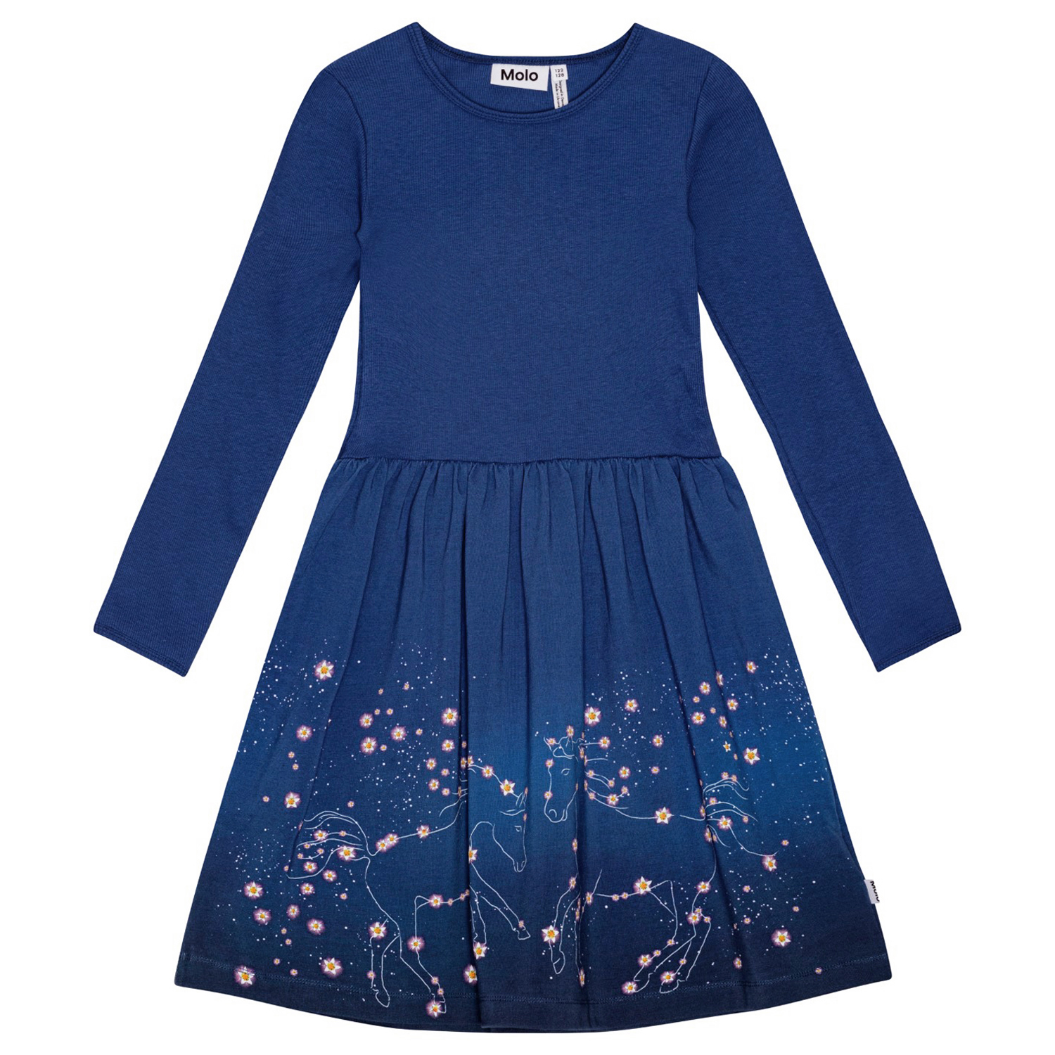 Marineblå langærmet kjole i økologisk bomuld. Overdelen er tætsiddende i en ribbet jersey, mens skørtet er i en glat jersey. Det er en kjole med plads til leg og bevægelse, samt den er nem at komme i. Kjolens skørt har et print af legende heste under en glitrende stjernehimmel.