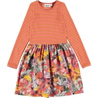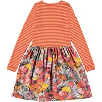Credence er en kjole med rød og gul stribet overdel i rib med lange ærmer og et skørt med print forskellige dyr og farvede blade.