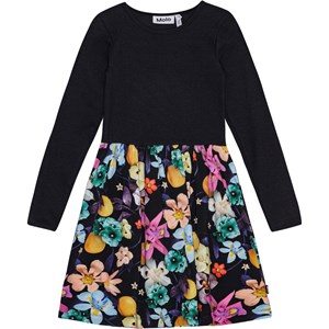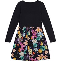 Langærmet sort kjole i økologisk bomuld, der forener en tætsiddende overdel i ribbet jersey med et glat jersey skørt. Kjolen er let at komme i og tilbyder masser af plads til leg og bevægelse. Kjolens skørt har et print af farverige blomster i friske farver, der træder flot frem på den sorte baggrund.