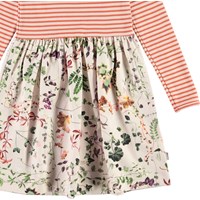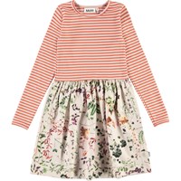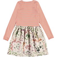 Credence er en kjole med rosa og rød stribet overdel med lange ærmer og et skørt med print af vilde blomster og blade.