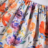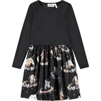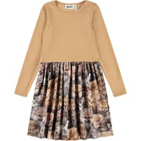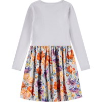 Lyslilla langærmet kjole i økologisk bomuld, der forener en tætsiddende overdel i ribbet jersey med et glat jersey skørt. Kjolen er let at komme i og har masser af plads til leg og bevægelse. Kjolens skørt har et print af farvestrålende blomster