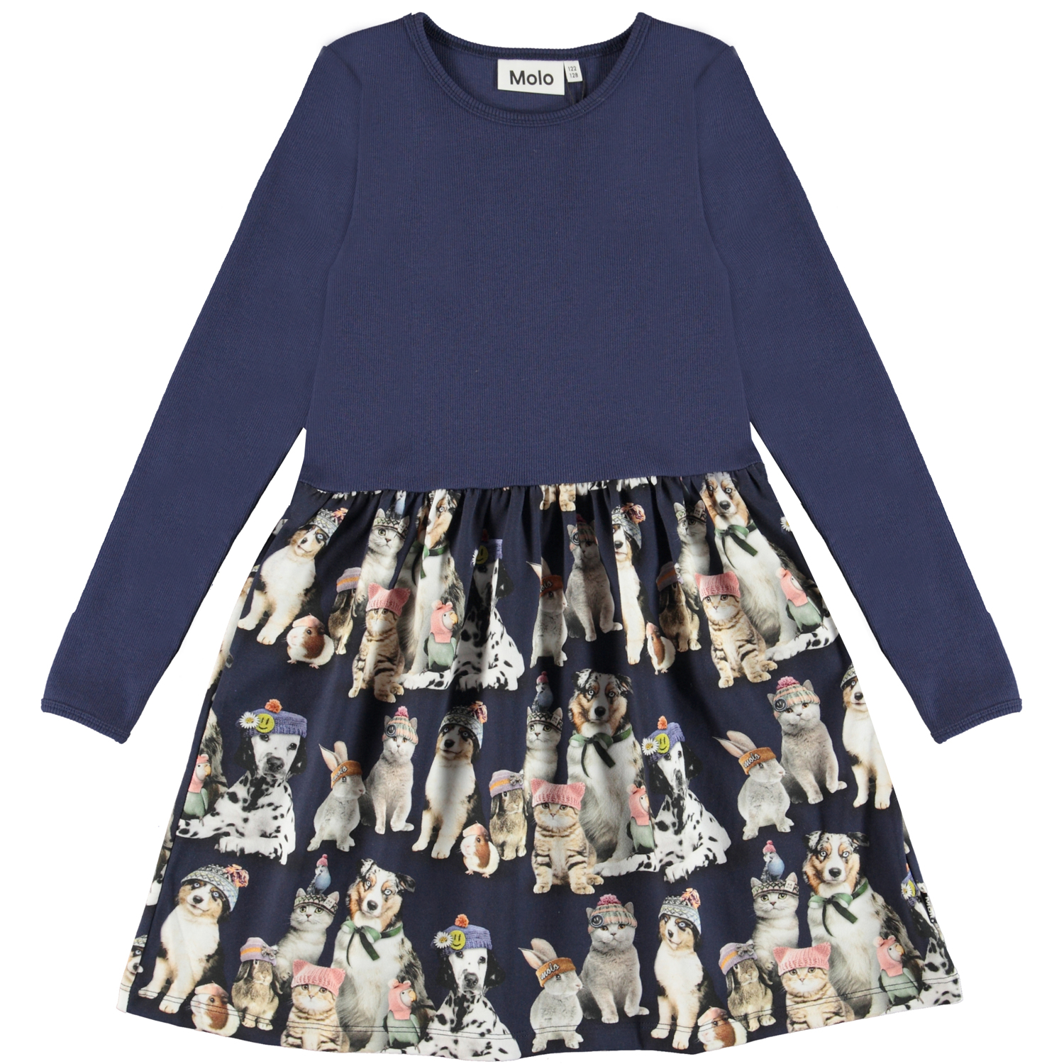 Credence er en kjole med blå overdel i rib med lange ærmer og et skørt med print forskellige dyr, som har huer på.