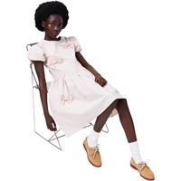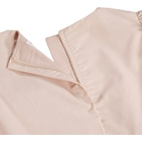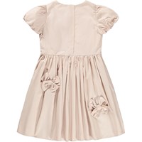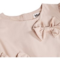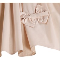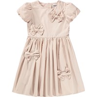 Nude knælang kjole med påsyet sløjfer i økologisk bomuld. Kjolen har en løs pasform med pufærmer og en skjult lynlås i ryggen, som gør den nem at tage af og på samt sikrer en god pasform.