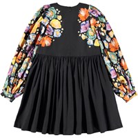 Kort sort kjole i økologisk bomuldspoplin. På ærmer og bryst er den dekoreret med flotte farverige blomster. Kjolen har en blød V-udskæring, er let oversize og har masser af rynk ved ærmer samt ved skørtet. De lange ærmer har kant og knaplukning ved håndleddet, der tilføjer ærmet fylde. Kjolen er let at komme i med den usynlige lynlås placeret på ryggen.