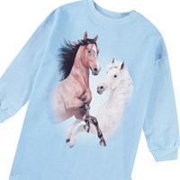 Lyseblå jerseykjole i blødt økologisk bomuld med ribkanter ved ærmer og hals. Kjolen er knælang og har en løs pasform med et frontprint af en hvid og brun hest, der danner et hjerte.