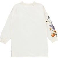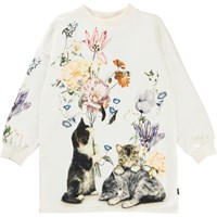Cyrella er en hvid sweatshirt kjole med print af katte og blomster på fronten.