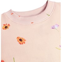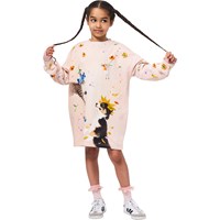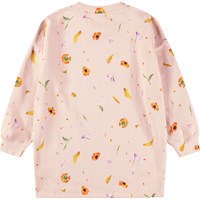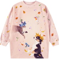 Lyserød jerseykjole i blødt økologisk bomuld med ribkanter ved ærmer og hals. Kjolen er knælang og har en løs pasform med et frontprint af en kat, fugl og hund i en regn af farverige blomster.