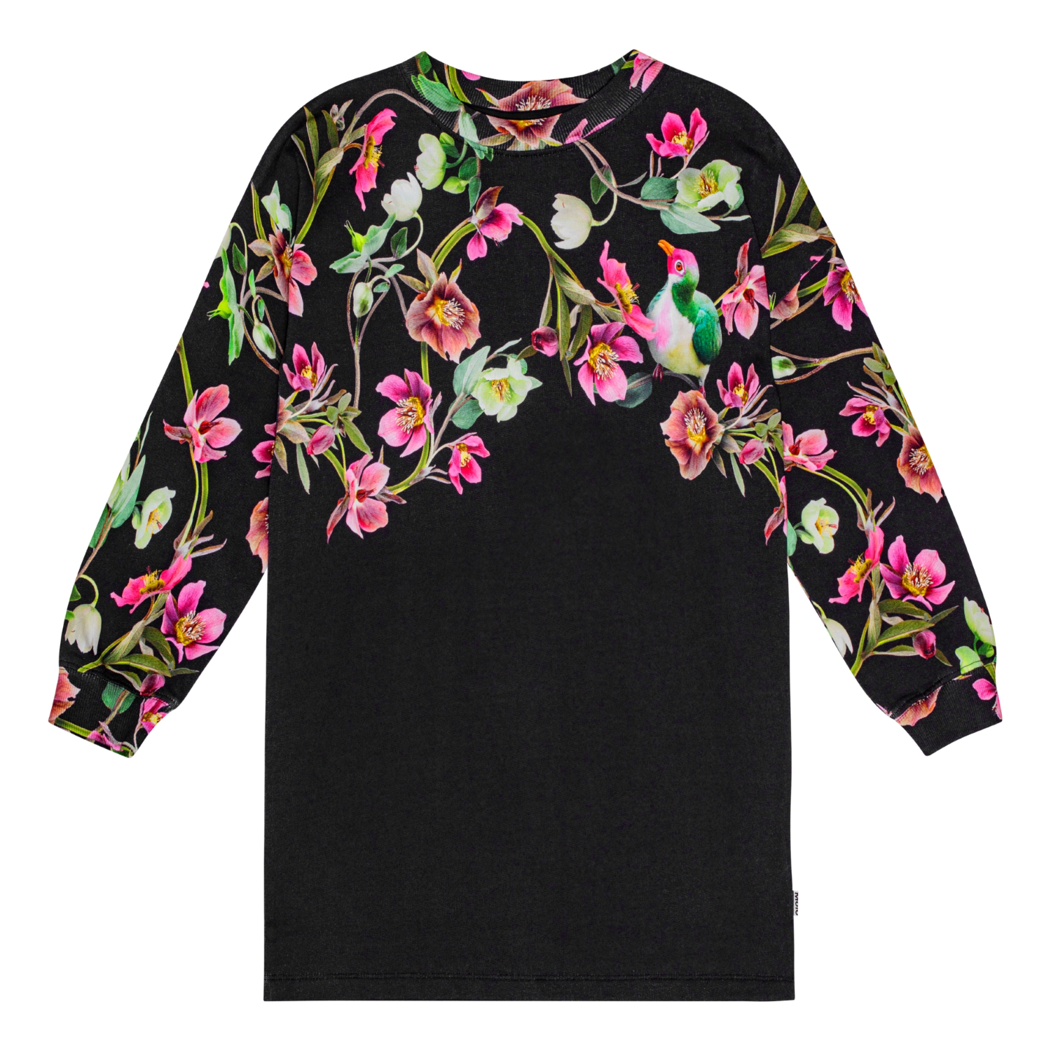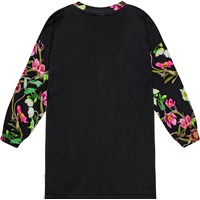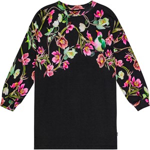 Sort jerseykjole i en blød økologisk bomuld. Kjolen er knælang og har en løs pasform med ribkanter ved hals samt ved ærmerne. Kjolen har et print på den øverste del af kjolen samt ærmerne af juleroser i hvide og lyserøde nuancer samt en fugl i matchende farver.