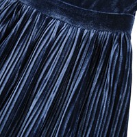Knælang blå velourkjole med lange ærmer, rund halsudskæring og paneler ved taljen og ærmekanten. Det plisserede skørt i velour tilføjer en flot detalje. Kjolen er nem at få på med en usynlig lynlås bagpå.