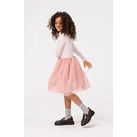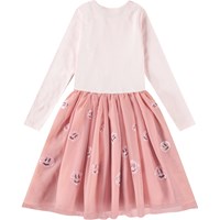Lyserød langærmet kjole med rosa tylskørt og smilende pailletansigter. Toppen er tætsiddende i ribbet bomuldsjersey med rund hals, skørtet går til knæet og har et bomuldsunderskørt.