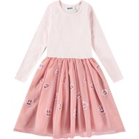 Lyseblå langærmet kjole med matchende tylskørt og smilende pailletansigter. Toppen er tætsiddende i ribbet bomuldsjersey med rund hals, skørtet går til knæet og har et bomuldsunderskørt.