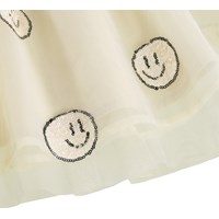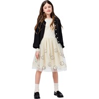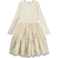 Råhvid kjole med lange ærmer og tylskørt med glade pailletansigter. Overdelen er tætsiddende og lavet i blød, ribbet bomuldsjersey med rund halsudskæring. Skørtet har knælængde og er foret med et behageligt bomuldsunderskørt for ekstra komfort.