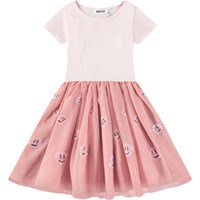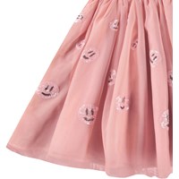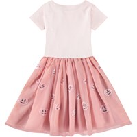 Lyserød kortærmet kjole med rosa tylskørt og smilende pailletansigter. Toppen er tætsiddende i ribbet bomuldsjersey med rund hals, skørtet går til knæet og har et bomuldsunderskørt.