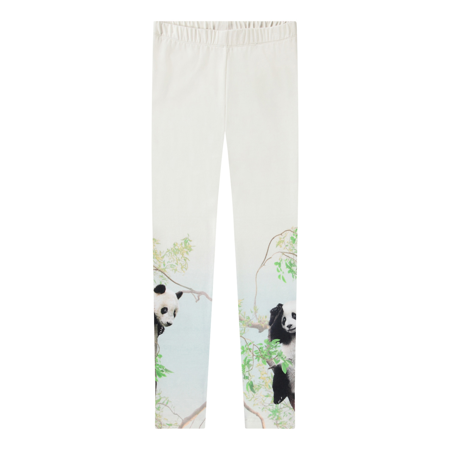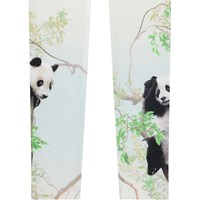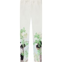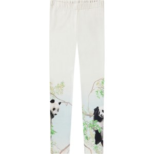 Hvide leggings i strækbart økologisk bomuld med elastik i taljen. De bløde leggings er tætsiddende med et print på lårene af pandaer i træerne.