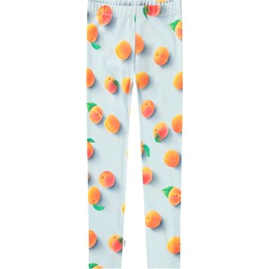 Lyseblå leggings i strækbart økologisk bomuld med elastik i taljen. De bløde leggings er tætsiddende med et allover print af solmodne abrikoser.