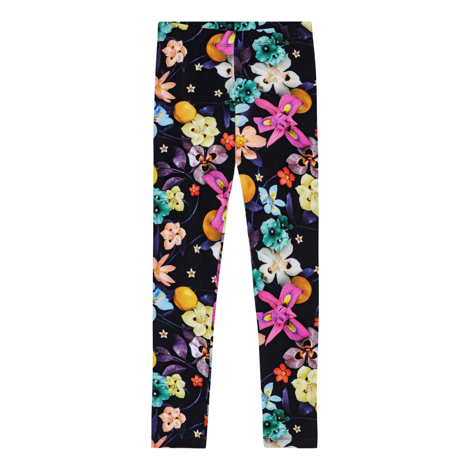 Sorte leggings i økologisk bomuld med tætsiddende pasform og elastik i taljen for komfort og let påklædning. De har et flot print af farverige blomster i friske farver, som træder tydeligt frem på den sorte baggrund. Leggings er perfekte til at style under kjoler, nederdele og store sweatre for et behageligt og trendy look.