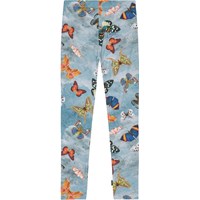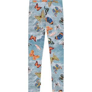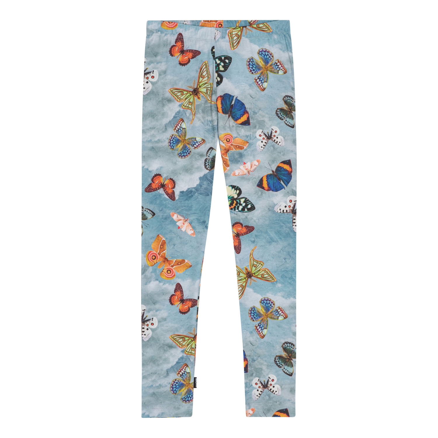 Blå leggings i økologisk bomuld med tætsiddende pasform og elastik i taljen for komfort og let påklædning. De har et print af farverige sommerfugle, der danser på en himmel i blå nuancer. Leggings er perfekte til at style under kjoler, nederdele samt til store sweatre for et behageligt og trendy look.