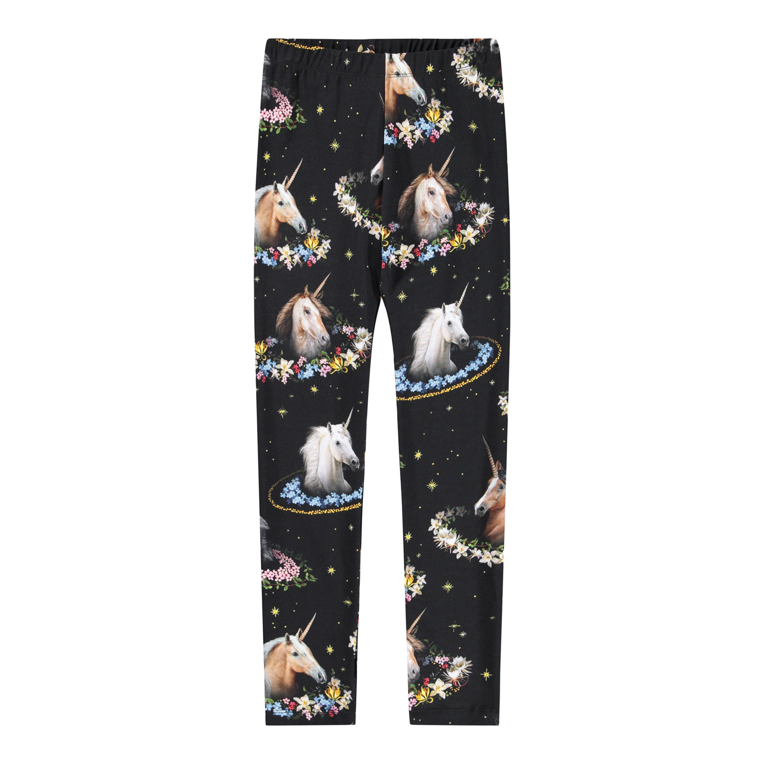 Sorte leggings i økologisk bomuld med en tætsiddende pasform samt elastik i taljen for maksimal komfort og nem påklædning. De tætsiddende leggings har et print af enhjørninger.