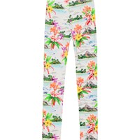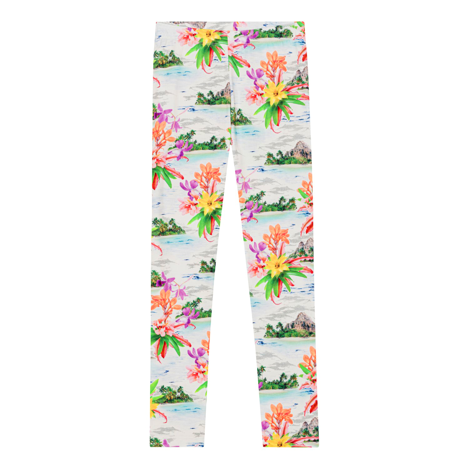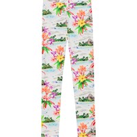 Lyse gamacher i økologisk bomuld. Gamacherne er tætsiddende og har elastik i taljen der gør dem nemme at komme i og behagelige at have på. Gamacherne har et alloverprint af øde øer, palmestrande og Hawaii blomster i friske farver