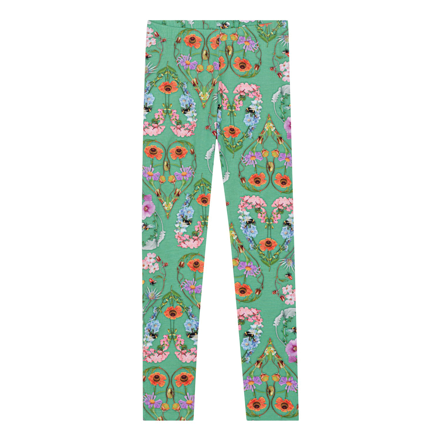 Grønne gamacher i økologisk bomuld. Gamacherne er tætsiddende og har elastik i taljen der gør dem nemme at komme i og behagelige at have på. Gamacherne har et multifarvet alloverprint af hjerter der er dannet af insekter og vilde multifarvet blomster.