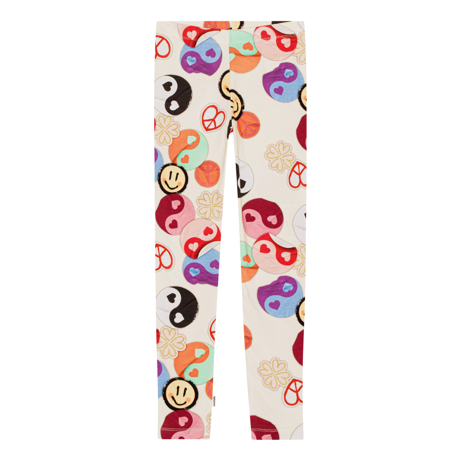 Råhvide gamacher i økologisk bomuld. Gamacherne er tætsiddende og har elastik i taljen der gør dem nemme at komme i og behagelige at have på. Gamacherne har et multifarvet alloverprint af Yin og Yang klistermærker.