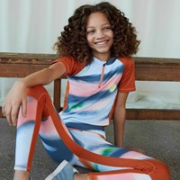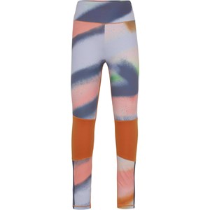 Olympia er et par farverige leggings med sprayprint samt orange panel ved knæene og blåt tekstbånd på siden af benene. Disse sportsleggings sikrer den helt rette komfort og fleksibilitet og sørger for, at der ikke er nogen hindring for bevægeligheden. Olympia er en del af Molo's sportskollektion, som er med til at binde mode og sport tættere sammen. Kombiner Olympia med en af Molo's toppe for en komplet sporty look. Molo’s sportskollektion er fremstillet med en unik high-performance teknologi kaldet HeiQ Smart Temp, der understøtter kroppens naturlige nedkøling. Kølefunktionen aktiveres, når du er varm og svedig. Kølefunktionen deaktiveres, når kroppen er nedkølet. HeiQ Smart Temp sikrer optimal komfort og ydeevne. Testet uafhængigt som sikkert for huden. .