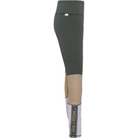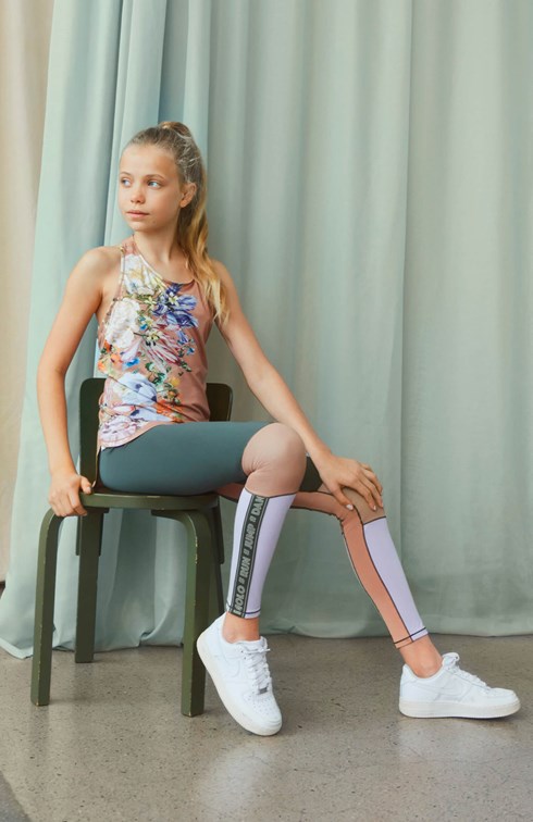 Olympia er et par leggings i grøn, beige og lyselilla med tekst bånd på ydersiden af den nederste del af benene. Disse sports leggings sikrer den helt rette comfort og fleksibilitet og sørger for, at der ikke er nogen hindring for bevægeligheden. Olympia er en del af Molo's sportskollektion, som er med til at binde mode og sport tættere sammen. Kombiner Olympia med en af Molo's toppe for en komplet sporty look. Molo’s sportskollektion er fremstillet med en unik high-performance teknologi kaldet HeiQ Smart Temp, der understøtter kroppens naturlige nedkøling. Kølefunktionen aktiveres, når du er varm og svedig. Kølefunktionen deaktiveres, når kroppen er nedkølet. HeiQ Smart Temp sikrer optimal komfort og ydeevne. Testet uafhængigt som sikkert for huden. .