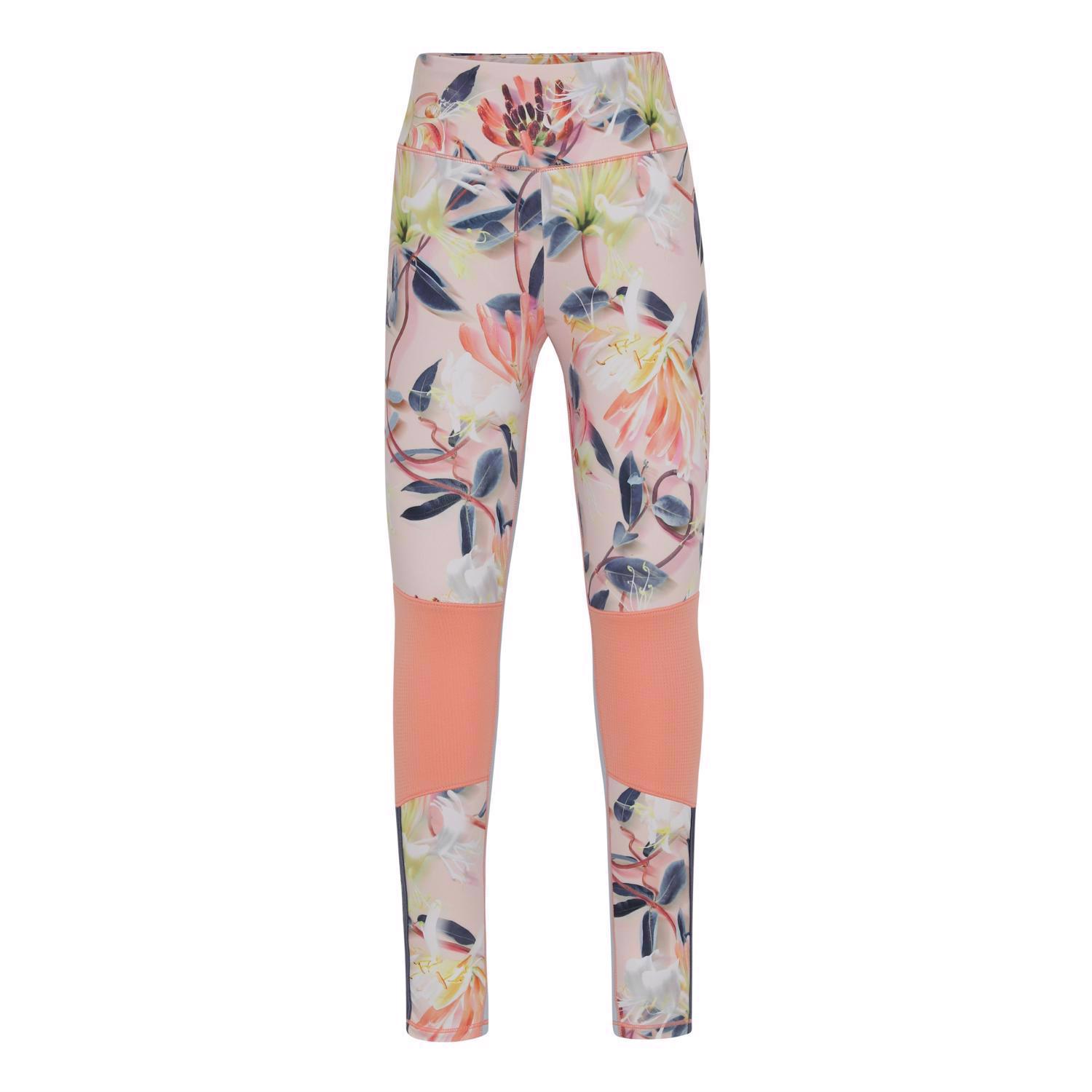 Olympia er et par lyse rosa leggings med blomster samt ferskenfarvet panel ved knæene og blåt tekstbånd på siden af benene. Disse sportsleggings sikrer den helt rette komfort og fleksibilitet og sørger for, at der ikke er nogen hindring for bevægeligheden. Olympia er en del af Molo's sportskollektion, som er med til at binde mode og sport tættere sammen. Kombiner Olympia med en af Molo's toppe for en komplet sporty look. Molo’s sportskollektion er fremstillet med en unik high-performance teknologi kaldet HeiQ Smart Temp, der understøtter kroppens naturlige nedkøling. Kølefunktionen aktiveres, når du er varm og svedig. Kølefunktionen deaktiveres, når kroppen er nedkølet. HeiQ Smart Temp sikrer optimal komfort og ydeevne. Testet uafhængigt som sikkert for huden. .