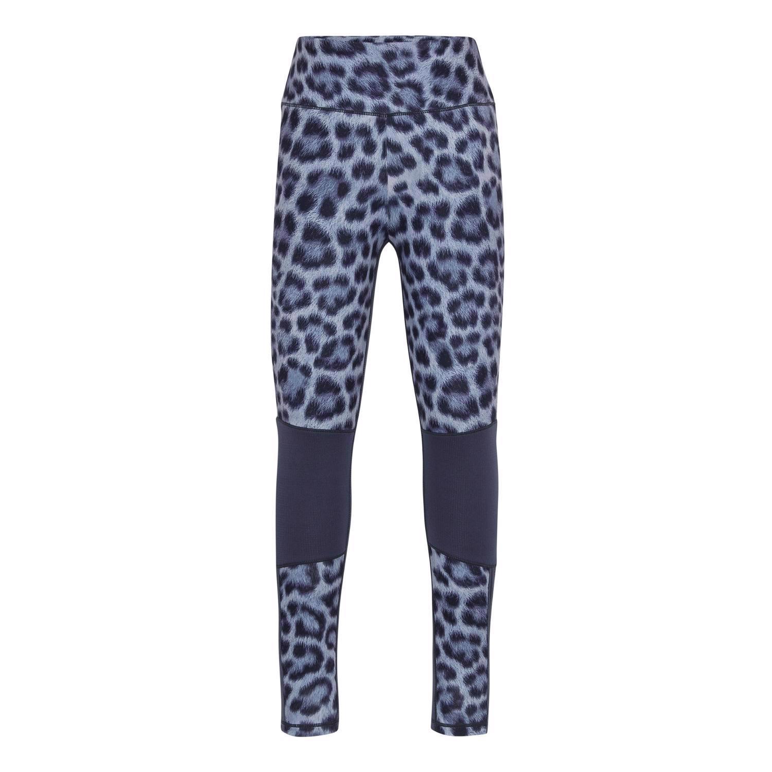 Olympia er et par blå leggings med leopardprint samt mørkeblåt panel ved knæene og blåt tekstbånd på siden af benene. Disse sportsleggings sikrer den helt rette komfort og fleksibilitet og sørger for, at der ikke er nogen hindring for bevægeligheden. Olympia er en del af Molo's sportskollektion, som er med til at binde mode og sport tættere sammen. Kombiner Olympia med en af Molo's toppe for en komplet sporty look. Molo’s sportskollektion er fremstillet med en unik high-performance teknologi kaldet HeiQ Smart Temp, der understøtter kroppens naturlige nedkøling. Kølefunktionen aktiveres, når du er varm og svedig. Kølefunktionen deaktiveres, når kroppen er nedkølet. HeiQ Smart Temp sikrer optimal komfort og ydeevne. Testet uafhængigt som sikkert for huden. .
