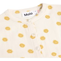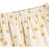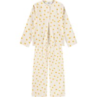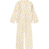 Råhvid pyjamas i blød, økologisk bomuld med lange ærmer og ben. Sættet består af en løs skjorte med tre knapper foran og et stort læg i midten, der giver ekstra fylde, samt et par behagelige bukser med elastik i taljen. Hele sættet er pyntet med et skønt print af smilende sole.