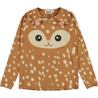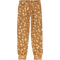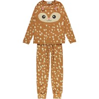 To delt nattøjsssæt i brun med hvide pletter, som ligner rådyr pels , samt øjne og ører på blusen. Bukserne har bindebånd i livet og blusen har lange ærmer.