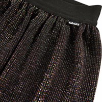 Plisseret nederdel i multifarvet glimmer. Nederdelen har elastik i taljen, så den kan bæres både oppe i taljen og på hoften. Skørtet har en længde til midt på skinnebenet og falder smukt i sin plissering.