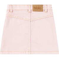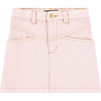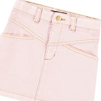 Denimnederdel i lyserød med brune stikninger. Flotte syninger foran, to sidelommer og bæltestropper.