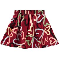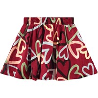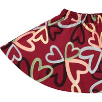 Rød nederdel i økologisk bomuld med elastik i taljen, der gør den nem at komme i og behagelig at have på. Den har en rundskåret facon, som falder flot til midt på låret. Printet består af mange håndmalede hjerter i forskellige farver, der sammensmelter og danner et væld af firkløvere.