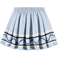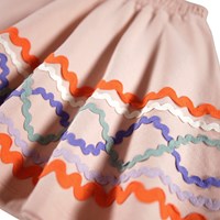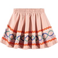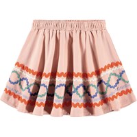 Rosa nederdel i økologisk bomuld med mønster af farvede påsyede bånd. Nederdelen har elastik i taljen, der gør den nem at komme i og behagelig at have på. Den har en rundskåret facon, som falder flot til midt på låret.