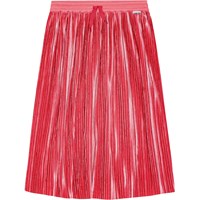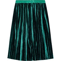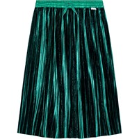 Plisseret nederdel i blødt grønt velour. Nederdelen har elastik i taljen med et bindebånd, der giver mulighed for at bære den både oppe i taljen og på hoften. Skørtet har en længde til midt på skinnebenet og falder smukt i den tunge velour.