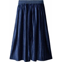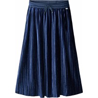 Plisseret nederdel i blødt mørkeblå velour. Nederdelen har elastik i taljen med et bindebånd, der giver mulighed for at bære den både oppe i taljen og på hoften. Skørtet har en længde til midt på skinnebenet og falder smukt i den tunge velour.