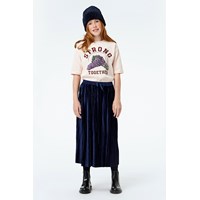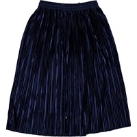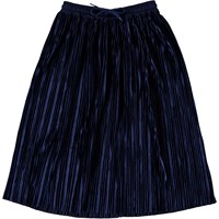 Becky er en pliseret blå nederdel i velour med god længde og bindebånd i taljen.