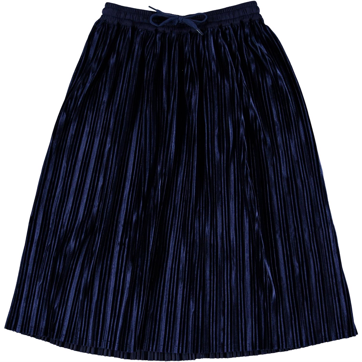 Becky er en pliseret blå nederdel i velour med god længde og bindebånd i taljen.