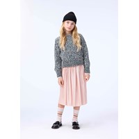 Plisseret nederdel i blødt rosa velour. Nederdelen har elastik i taljen med et bindebånd, der giver mulighed for at bære den både oppe i taljen og på hoften. Skørtet har en længde til midt på skinnebenet og falder smukt i den tunge velour.