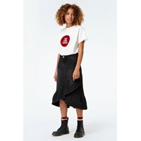 Belinda er en sort denim nederdel med flæse og wrap-effekt foran. Nederdelen har lommer og bæltestropper.