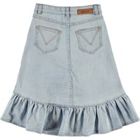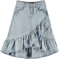 Belinda er en lyseblå denim nederdel med god længde og slå-om effekt med flæsekant. Belinda har knappelukning på fronten og lommer.