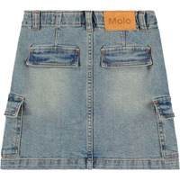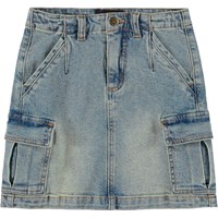 Blå denimnederdel i økologisk bomuld. Nederdelen er knælang, har en almindelig pasform og taljen er udstyret med bæltestropper, knap og lynlåslukning, samt en indvendig elastik i taljen, der sikrer den rette pasform til alle børn. Nederdelen har for- og baglommer samt store cargolommer på siden.