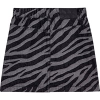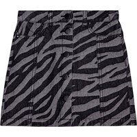 Zebrastribet denim nederdel med sorte matte knapper som lukning. Nederdelen når til midt på låret, har en talje med bæltestropper og forlommer. Nederdelen har et flot snit med detaljesyninger fra lommerne og ned.