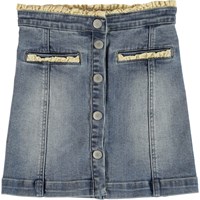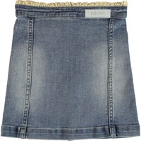 Berit er en denim nederdel i vasket look med feminine flæsekanter ved lommer og talje. Berit har knapper på fronten.