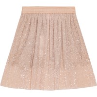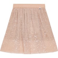 Knælang pudderfarvet pailletnederdel. Nederdelen har elastik i taljen samt et underskørt, så pailletnederdelen falder flot og tungt udenpå.